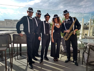 Banda jazz con varias formaciones: cuarteto formado por tuba, banjo, saxo y trompeta. Quinteto o sexteto añadiendo trombón y/o voz femenina. Septeto con percusión y hasta octeto con piano. Adaptándose a las necesidades del evento.